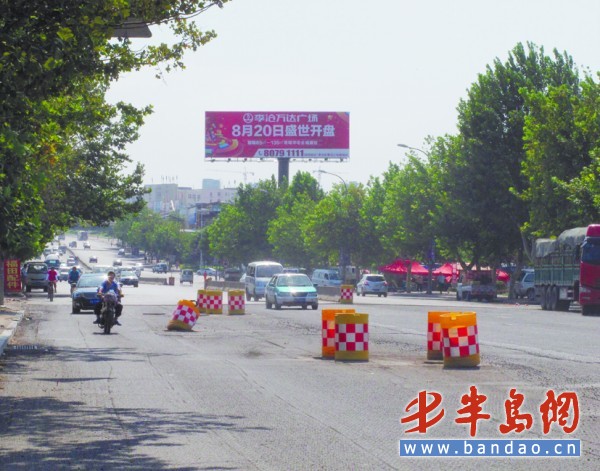 9月4日下午1時30分許,記者駕車從黑龍江路海爾工業園附近出發,沿黑龍江路、海爾立交橋、青山路、重慶路行駛,此時多條主干道均不在交通高峰期,車流量雖然很大,但并未出現交通擁堵。雖然不堵車,可是由于路況太差,這段路依然不太好跑。這段路程剛開始,就遇到了一處由防撞桶擺成的“陣”,10個防撞桶占據了近兩排車道,過往車輛左突右搶穿梭前行。而在黑龍江路上,坑洼不平、高低起伏的路段隨處可見,有的坑洼路段由于落差太大,過往車輛只得紛紛減速行駛,車速稍快就容易傷及車輛底盤及保險杠,在海爾立交橋上橋路的一處積水處,路面上有多個深在七八厘米的坑,過往車輛紛紛向左行駛避開,來不及避開的車輛也就緊急減速,勉強通過。