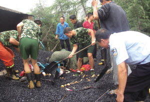 在事發現場, 一輛運輸瀝青的貨車側翻在路邊,約有上百度高溫的瀝青淌的滿地都是,被困的商販被掩埋在瀝青底下,情況十分危急。根據現場情況,指揮員一面詢問現場有關情況,一面部署救援。通過周圍目擊者得知,被埋者是路邊水果攤小販。在確定了水果攤的大體位置后,諸城大隊密州中隊的消防官兵利用鐵锨對瀝青進行清理。在上百度高溫的瀝青上,不少消防官兵的鞋子都被燙破了,商販車上的蘋果不少也被燙熟。經過十分鐘左右的清理,被埋的三輪車逐漸顯現出來。經過救援官兵繼續努力,很快發現并救出了車下的商販。令現場救援人員興奮的是,被掩埋的商販還有生命跡象。此時,等候在現場的120急救人員立即將傷者送往醫院搶救。