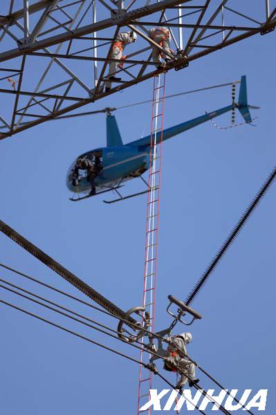 10月17日,工作人員在對±660kV電壓等級輸電線路實施帶電維修。新華社記者 郭緒雷 攝