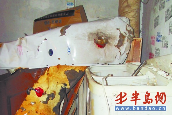 劉洪福說,這房子是他去年剛買的二手房,當時過戶時,原房主的一些老電器就沒有帶走,都留了下來。但是對于熱水器為什么會爆炸,他也是一頭霧水,“這個‘古月牌’熱水器是原房主留下來的,之前一直用著也沒有什么問題。但是能肯定的是熱水器是從里面往外爆裂的,你看看外面樓道上的熱水器的鐵片,完全沒了樣子了。”據他介紹,他從原房主那里得知,當初熱水器是從寧夏路和山東路交會處的某家電器商城買的,他通過多方打聽后,找到了當初這個熱水器品牌的青島總代理方,而且青島總代理方也已經和廠家聯系上了,“他們說28號來看看,具體會有怎么樣的解決方案,我們還得再商量!眲⒑楦Uf。