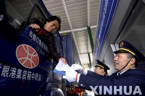 11月30日,在榮成市龍眼港,貨車通過中韓陸海聯(lián)運通道。新華社記者郭緒雷攝