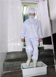 “食品安全絕對要放在首位,馬虎不得。”基地負責人李強打量著記者的裝束,仔細檢查哪里不合格。“把頭發都塞進去。”他說,這里的工作人員進入大加工車間,必須過三道關,進入更衣室“全副武裝”后,還得洗手、泡鞋等消毒,再到風淋室吹風。
