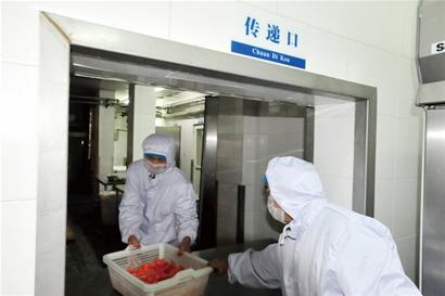 走進生產車間,記者感到了絲絲涼氣,為了保證食品的溫度,車間里沒有裝暖氣和空調,工人干活時需要多穿些厚衣服。倉庫、冷庫、消毒間、葷菜加工間、素菜加工間、常溫庫、包裝間……整個生產基地分門別類,每個房間都有它獨立的應用功能,而且菜品的傳遞都有專門的傳遞口,食材從進門后到最終加工成盒飯,是不走回頭路的,從出倉門直接運送到列車上。