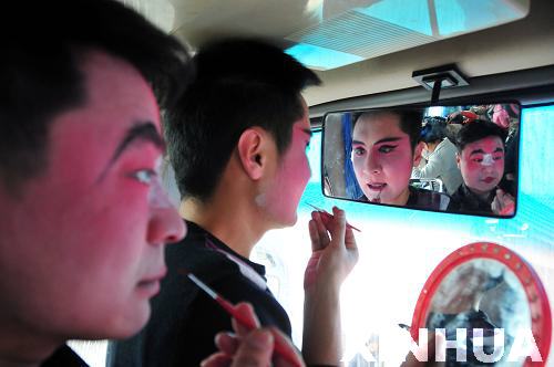 1月28日,山東省乳山市呂劇團的演員在大巴車里化妝。(劉國賢 攝)