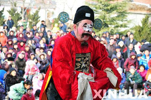 1月28日,山東省乳山市呂劇團的演員在育黎鎮西紀村文化廣場為村民表演新編古裝劇《糊涂官》。(劉國賢 攝)