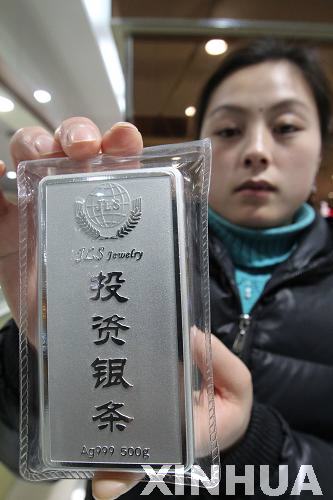 1月30日,在山東省臨沂市郯城縣一家超市銀飾品專柜,工作人員展示一款投資銀條。新華社發(fā)(張春雷 攝)