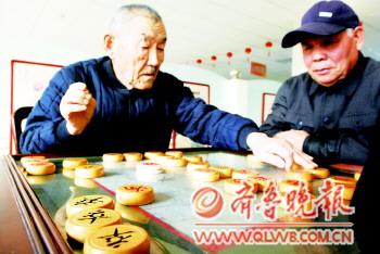 馮光耀老人和他的朋友認真地研究象棋每一步的走法。