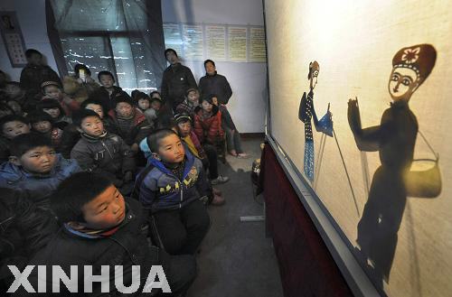 3月2日,山東省棗莊市山亭區宋莊小學學生在觀看皮影戲《雷鋒的故事》。 (李宗憲 攝)