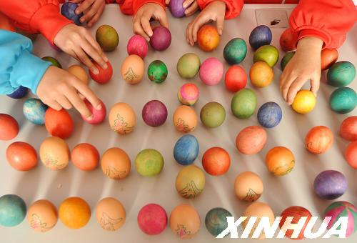3月20日,山東省沂源縣南麻第二小學幼兒園的小朋友們在做“立蛋”游戲。新華社發(fā)(趙東山 攝)