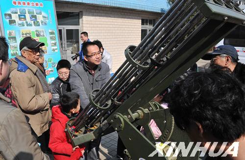 3月25日,濟南市民在濟南市氣象臺參觀人工增雨設備。新華社記者 徐速繪 攝