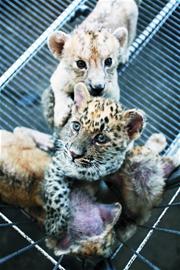 昨日上午,記者來到青島森林野生動物世界的育幼室看到,4只小獅子和金錢豹“金金”只有小貓那么大,室內還生著火爐!耙驗閾男—{子和小豹子感冒,育幼室內溫度要一直保持在25攝氏度!泵瞳F區飼養員尚延洲說。