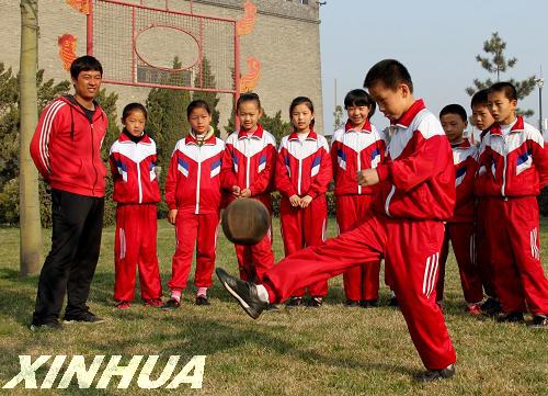 3月29日,山東省淄博市臨淄區(qū)金茵小學(xué)的學(xué)生在專(zhuān)業(yè)隊(duì)員的指導(dǎo)下練習(xí)蹴鞠。新華社發(fā)(崔立來(lái)攝)