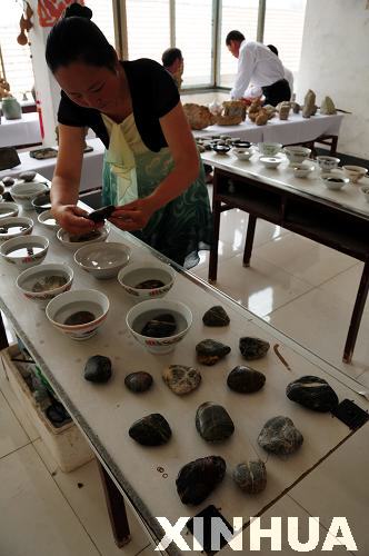 5月18日,山東省郯城縣馬頭鎮(zhèn)農(nóng)民徐連勤在“農(nóng)家博物館”整理象形石頭。(房德華 攝)