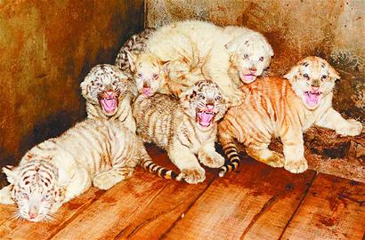 昨日,濟(jì)南野生動(dòng)物世界的雙胞胎“姐妹”孟加拉虎“莉莉”和“雅雅”雙雙添喜,于4月6日同時(shí)產(chǎn)下3只多色虎寶寶。目前,6只小虎(1只金虎、2只雪虎、3只白虎)健康活潑,惹人喜愛。 (本報(bào)記者 呂傳泉 攝)