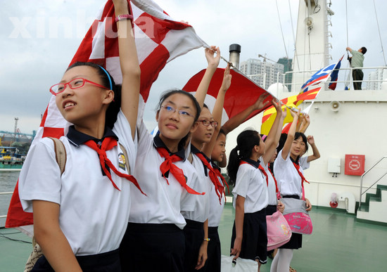 7月10日,青島包頭路小學(xué)的同學(xué)們與海警叔叔一起為艦艇懸掛滿旗,迎接航海日。