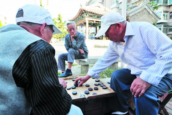 圖③:兩名老人在大廟前對弈。有了大廟作為背景,對弈的場景更顯愜意。