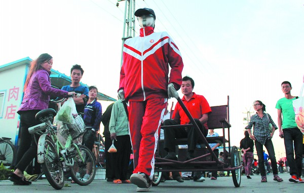 只見這個機器人身著校服、腳穿帆布鞋、頭戴太陽帽和墨鏡。每走一步,機器人的胳膊都向上抬一下,然后腿部膝關節打彎,邁步向前。后面車上拉的正是這個機器人的制造者——56歲的大皂孫家村村民郭恩成。拉車的機器人酷似真人,雖然手還沒有長出來,手腕被鋼絲和布條固定在兩輪車的車把上,但是頭、身子、胳膊、腿樣樣都有。
