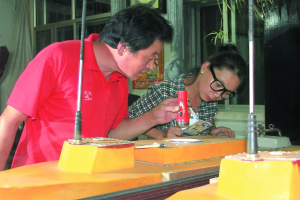 好奇的行人聚在一起觀看機器人的內部結構。只要一個鼠標就能控制機器人行走的整個過程。機器人拉車的動力是由一塊電池來提供,開關就在車座底部。郭恩成發明的遙控釣魚船由各種廢舊材料制成。