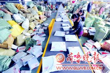 12日,在濟(jì)南申通快遞公司內(nèi),工作人員正在整理快件,他們身后的快件堆積如山。“雙十一”剛過,雖然從目前看,各家快遞企業(yè)尚未出現(xiàn)“爆倉”的情況,但業(yè)內(nèi)人士預(yù)計(jì),13日、14日將迎來進(jìn)件高峰,業(yè)務(wù)量將達(dá)到平時(shí)的數(shù)倍甚至十倍。