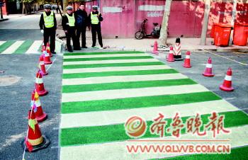 近日,槐蔭區匡山小區槐蔭實驗小學門口出現了濟南市第一條社區“綠色斑馬線”。白綠相間的人行橫道更為醒目,也為學生開辟了一條綠色的交通安全通道。 本報記者 董釗 通訊員 李福芳 攝影報道
