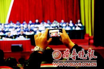 1月10日上午,市政協十二次二屆會議勝利閉幕,一名政協委員用手機拍攝下閉幕一刻留作紀念。