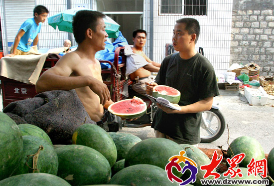在酷暑天采訪瓜農。(徐延春 攝)