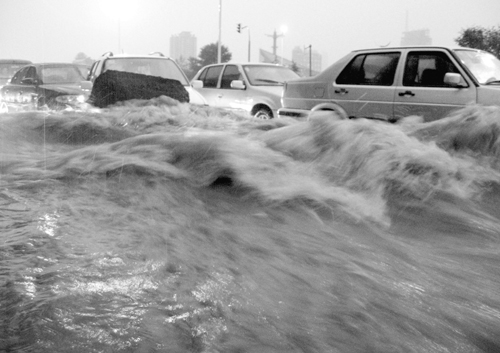 在濟南市馬鞍山路上拋錨的汽車(7月18日攝)。7月18日傍晚,一場強暴雨襲擊濟南市。□新華社發