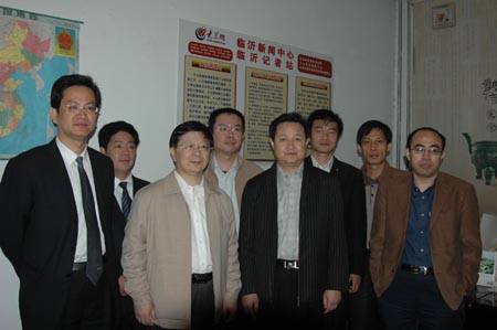 中共山東省委宣傳部副部長劉保聚(左五),大眾報業集團黨委副書記、副總編李壯利(左三),臨沂市委宣傳部副部長劉廣闊(左一),大眾網總編輯(右一),齊魯晚報副總編、今日沂蒙總編輯劉忠信(左四),大眾網臨沂頻道總編輯、臨沂大眾網主編王濟常(左二),大眾網增值業務中心主任范榮鵬(右二),臨沂大眾網技術部主任劉二陽(右三)合影留念