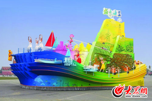 記者近距離觀察,彩車長15米,寬約6米,以書山、海洋為主體造型,從車頭至車尾,藍色漸變?yōu)榫G色,綠色又漸變成黃色,巧妙地將山海連為一體。車底部是噴涌向前的海浪,由層疊的書頁組成,造型流暢,氣勢磅礴。車中部為透明材質(zhì)的城鄉(xiāng)一體化發(fā)展建設浮雕,包括濟南解放閣、現(xiàn)代化建筑群、新農(nóng)村生活風貌、風力發(fā)電組、高速公路、海上鉆井平臺等。車后部是由三套史冊組成的泰山山脈。