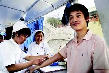 1日上午11點50分,建設路與太白東路交會處的廣場旁,濟寧市紅十字會中心血站的采血車前,有10多名市民正在填寫登記表。采血車上,市民劉娜剛獻了200毫升血,正在車上休息。劉娜說,這是她第三次參加無償獻血。2008年,她第一次參加無償獻血,心里有點緊張,“現在沒有膽怯的心理了。”