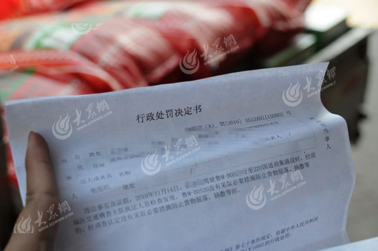記者從帖子貼出的照片上看到,被處罰車輛是牌號為“魯MB05**”的白色農(nóng)用車,車內(nèi)裝了大米等,大米高出車斗。在行政處罰決定書上,記者看到違法事實(shí)及依據(jù)上寫著“14日,張**駕駛魯MB05**行至220國道尚集路段時,經(jīng)濱城區(qū)交通稽查大隊執(zhí)法人員檢查發(fā)現(xiàn),沒有采取必要措施防止貨物脫落、揚(yáng)撒等”。