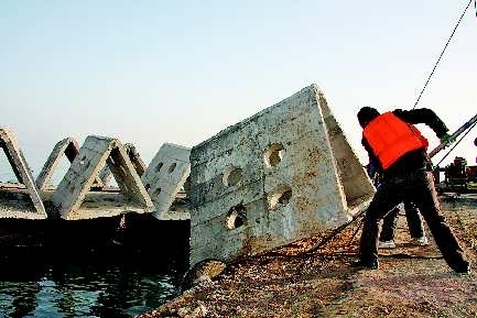 9日上午7點,黃家塘碼頭,一輛大吊車正將重達2噸的三角大件人工魚礁穩穩當當地搬上船。7點半,在“嗚嗚”的馬達聲中,兩艘船一齊駛向碼頭東北方向4公里處。船上的工人將20塊人工魚礁投入大海,濺起大片水花。據介紹,這是今年的第22次人工魚礁投放。