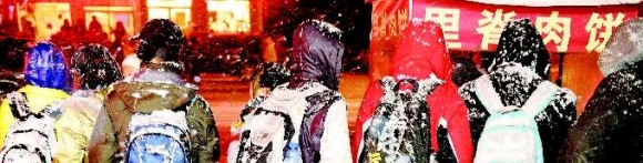 15日,煙臺解放路上剛剛放學(xué)的學(xué)生在雪中買肉餅。本報記者郭建政攝