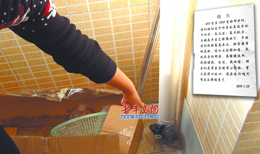 記者隨后來到潘先生所說的地址,裕環路90號是一排高層居民樓,有十八層之高,樓下兩層是網點房,樓上是住戶。在單元樓道門外看到一張《敬告》,上面寫著:“403室至1803室的鄰居們,你們的陽臺下水管不是洗衣機下水管,冬天凍,夏天滋生蚊蟲,關鍵是平臺已經腐蝕了,雖然你們住得高高在上,但它要有地基的,這個大家都知道,我現在告訴鄰居,再繼續流水,我就堵死,不過,我相信,鄰居們是有素質有公德的,望大家將心比心,實在不行咱只有走法律程序了。”