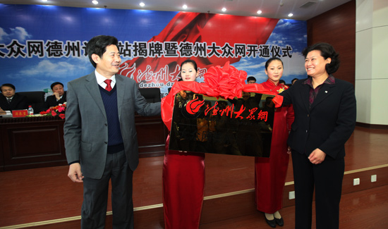 德州市委書記、市人大常委會主任吳翠云(右),大眾報業集團黨委書記、董事長、總編輯傅紹萬(左)共同為大眾網德州記者站揭牌。