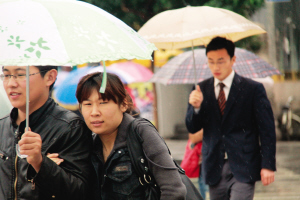 昨日省城街頭,人們換上了長衣長褲。連日的降雨,讓省城的氣溫直降 記者 傅琪媛 攝