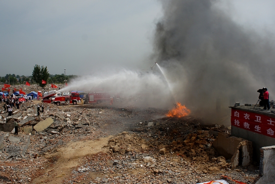 各部門各就各位,在一陣陣轟鳴聲中,救援車、急救車紛紛趕到地震現場,這邊展開了被困人員的搜救,那邊學生和撤離人員已經被紅十字會的工作人員疏散開來,他們有條不紊地趕到了民政部門搭建的臨時安置點。衛生防疫人員開始現場防疫。由于地震引發了火災,菏澤市消防局出動了7輛消防車趕來救火。環境監察人員同時展開泄漏氣體的監測。熱力管道破裂,菏澤市城管局的工作人員緊急展開搶救,同時交通、通訊、民政、衛生、氣象、地震、電力、燃氣以及軍區、武警等應急救援隊伍也在現場展開了工作。