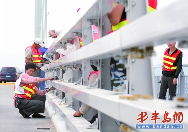 據(jù)現(xiàn)場施工人員介紹,等業(yè)主確定護欄的走向以后,他們就要對護欄上的螺絲進行加固。據(jù)山東高速青島公路有限公司總工程師邵新鵬介紹,6月27日,按照法定程序,青島膠州灣大橋順利通過了交工驗收,并于6月30日正式通車,但是根據(jù)《公路工程竣(交)工驗收辦法》和交工驗收委員會的意見 ,他們還要對局部護欄進行線形調整,從而使護欄更加流暢和美觀,而該項工作將在7月7日前完工。