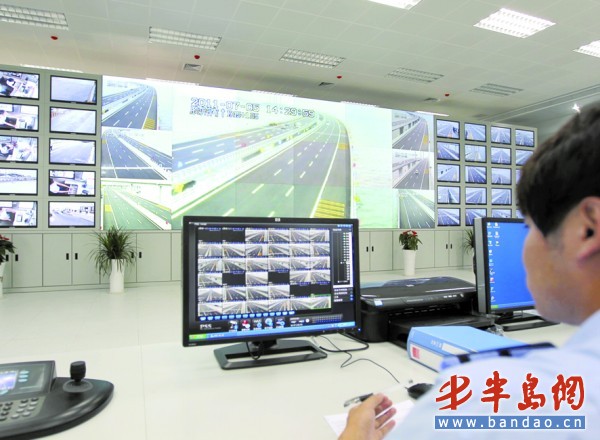 同時,在位于大橋紅島端的膠州灣大橋管養(yǎng)中心,在中心二樓的信息監(jiān)測中心里,記者看到,整整一面墻壁上都掛滿了監(jiān)控屏幕,大橋整體運行情況以及各個重要節(jié)點的情況都一目了然。據(jù)信息監(jiān)測中心負責人周義介紹,該監(jiān)控屏幕共由47塊拼接屏組成,橋上任何區(qū)域的信息都能任意獲取,2公里內形成聚焦。