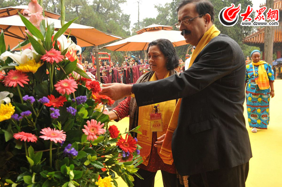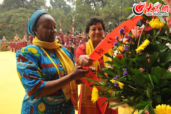 隨后,在《天下大同》的樂奏聲中,觀禮臺嘉賓手持鮮花依次登上月臺,插花成“儒濟天下”字樣。此景應(yīng)和了本次孔子文化節(jié)主題“儒濟天下,和寧四方”。其中,剛剛獲得第六屆聯(lián)合國教科文組織“孔子教育獎”的“共同的阿爾法烏祖威”項目負責人迪奧達塔· 邦吉葉女士、“讀書空間”項目負責人賈什瑞·阿卡里婭女士、“巴基斯坦旁遮普邦政府掃盲秘書阿拉·巴克什·馬利克博士等3人,也登上月臺恭恭敬敬地獻上花籃。