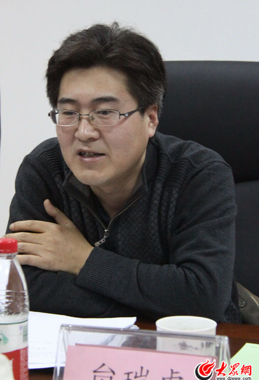 山東文交所董事長贠瑞虎匯報工作。