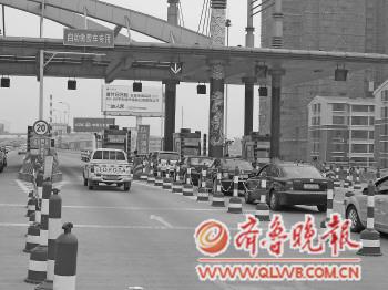 ◥在濟南北收費站,ETC車道暢通無阻,而人工收費車道前等待進入高速的車輛排起了長隊。 本報記者 楊傳忠 攝