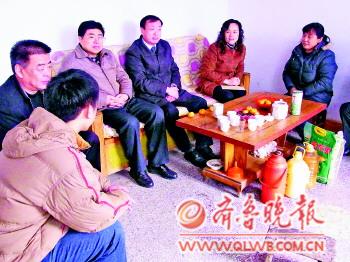 15日,在濟(jì)南平陰中橋口村,濟(jì)南大學(xué)大二學(xué)生趙錫偉在家中見(jiàn)到了來(lái)家訪的濟(jì)南大學(xué)副校長(zhǎng)張碩秋和經(jīng)濟(jì)學(xué)院的十幾位老師。老師們給趙錫偉帶來(lái)了慰問(wèn)金和米面油等生活必需品,隨隊(duì)前來(lái)的任課老師還叮囑趙錫偉,打工也要兼顧身體,不要耽誤了學(xué)習(xí)。