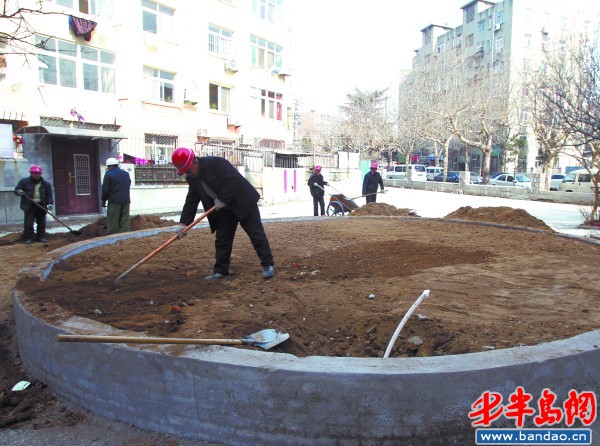 2月29日,市北區(qū)通榆路一居民樓前,施工人員正在對(duì)樓院地面進(jìn)行硬化 ,并修建了街心花園。 記者 何毅