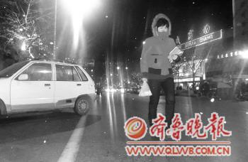 1日晚7時,在東營市區,市民穿著棉衣在小雪中前行。 本報記者 段學虎 攝