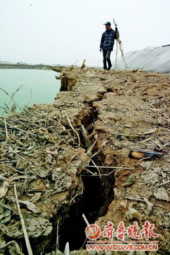 [提要] 蔬菜大棚邊的土不停塌陷,村民們每天干活都提心吊膽。水塘周邊的其他幾個大棚,也因土壤塌陷,地錨紛紛露出地面,鐵絲隨處可見。記者數了一下,在池塘周邊共有7個蔬菜大棚,因池水沖擊土壤塌陷,大棚地錨裸露在地面上。