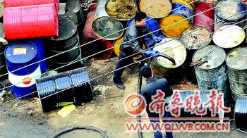 [提要] 白色塊狀物,一添可改變廢機油顏色 3月9日下午2時許,一輛滿載鐵皮油桶的白色卡車開進濟南張莊路的一個院子里,同時,紅色鐵門應聲關閉。3月10日下午3點鐘左右,在附近的記者和民警發現,一輛白色廂式貨車開進了汽修廠院子,接著廂式貨車的門打開,工人從上面卸了幾包油桶。