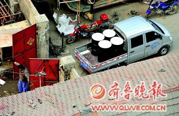 3月9日下午2時許,一輛滿載鐵皮油桶的白色卡車開進濟南張莊路的一個院子里,同時,紅色鐵門應聲關閉。幾名工人從廠房內走出,開始把油桶從車上卸下,工人們卸下了近20桶。