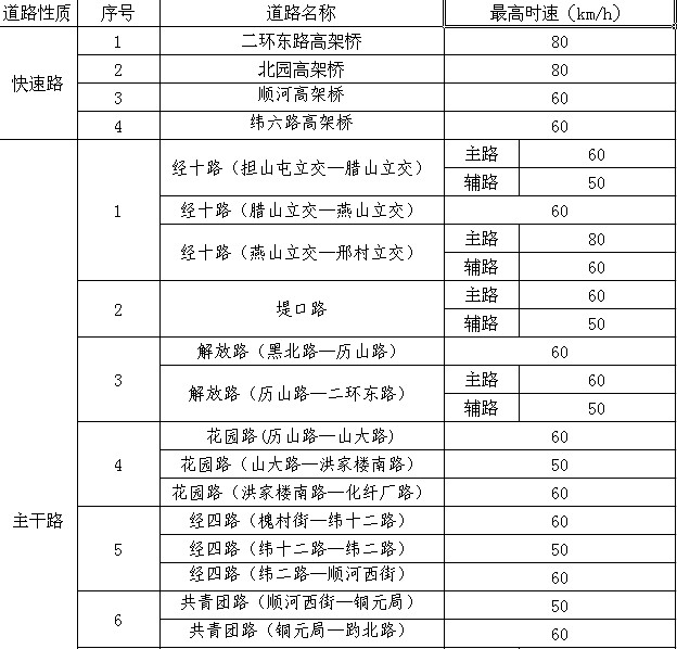 本次調(diào)整決定對二環(huán)東路高架橋和北園高架橋2條快速路的最高時速由原來的60公里/小時提高到80公里/小時;對順河高架橋和緯六路高架橋2條快速路的最高時速重新界定為60公里/小時。
