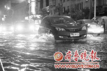 9日晚8時,濟南少年路低洼地區積水較重,車輛涉險通過。 本報記者 楊寧 攝